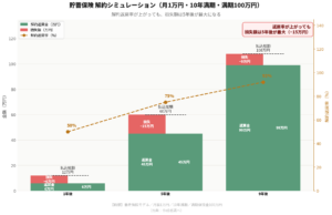 たとえば月1万円を積み立てる10年満期の養老保険(満期100万円)で考えると、こうなります。