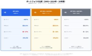 2005年から2024年の約20年間で、以下の3つのポートフォリオを比較しています(初期投資1万ドル・年1回リバランス・配当再投資あり)。