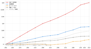 超長期で見ると株式のリターンが圧倒的で、ゴールドはほとんど伸びていないように見える図です。