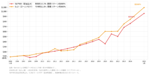 - S&P500(配当込み):年率約11.2% 累積リターン約880%