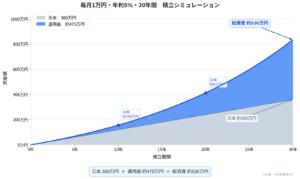 例えば「年利5%・毎月1万円・30年間積み立てた場合のシミュレーション図を作ってください」と指示するだけで、グラフを作ってくれます。ぼくは投資系の記事をよく書くので、この機能はかなり重宝しています。